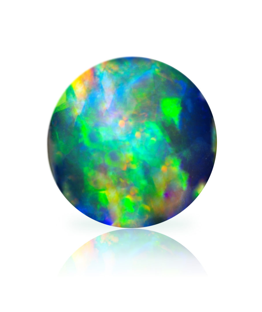 L’opale est une silice amorphe hydraté contenant de 1 à 21% d’eau et ses versions précieuses irisées contiennent en moyenne 6% à 10% d’eau. L’eau, prisonnière dans de microscopiques sphères de silice qui sont empilées régulièrement dans la masse (comme des balles de ping-pong dans une boite), permet un effet de diffraction de la lumière qui crée cet effet de jeu de couleurs révélant les couleurs du spectre. Les couleurs varient, notamment en fonction de la taille des sphères de silice, qui feront apparaitre du violet quand elles font environ 0.1micron de diamètre et du rouge quand elles font environ 0.2 micron, toutes les autres couleurs du spectre (de l’arc-en-ciel) apparaissant dans les dimensions intermédiaires.
