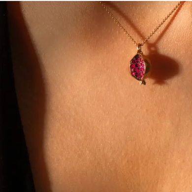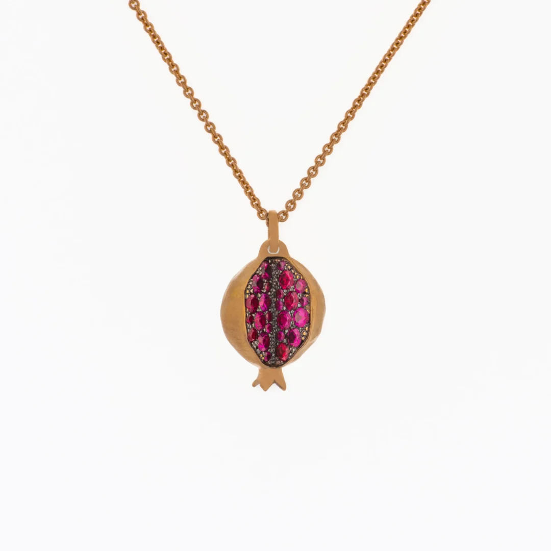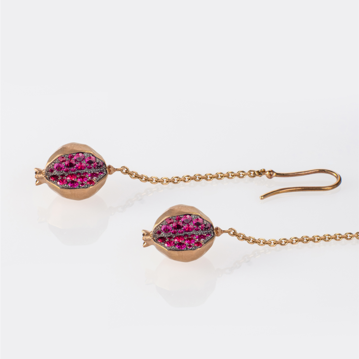 Habillée d’un diamant cachée dans sa corolle, notre grenade Ermione possède un coeur serti de rubis flamboyants et un corps en or rouge, délicatement martelé pour reproduire les formes de sa peau et sa couleur légèrement cuivrée.