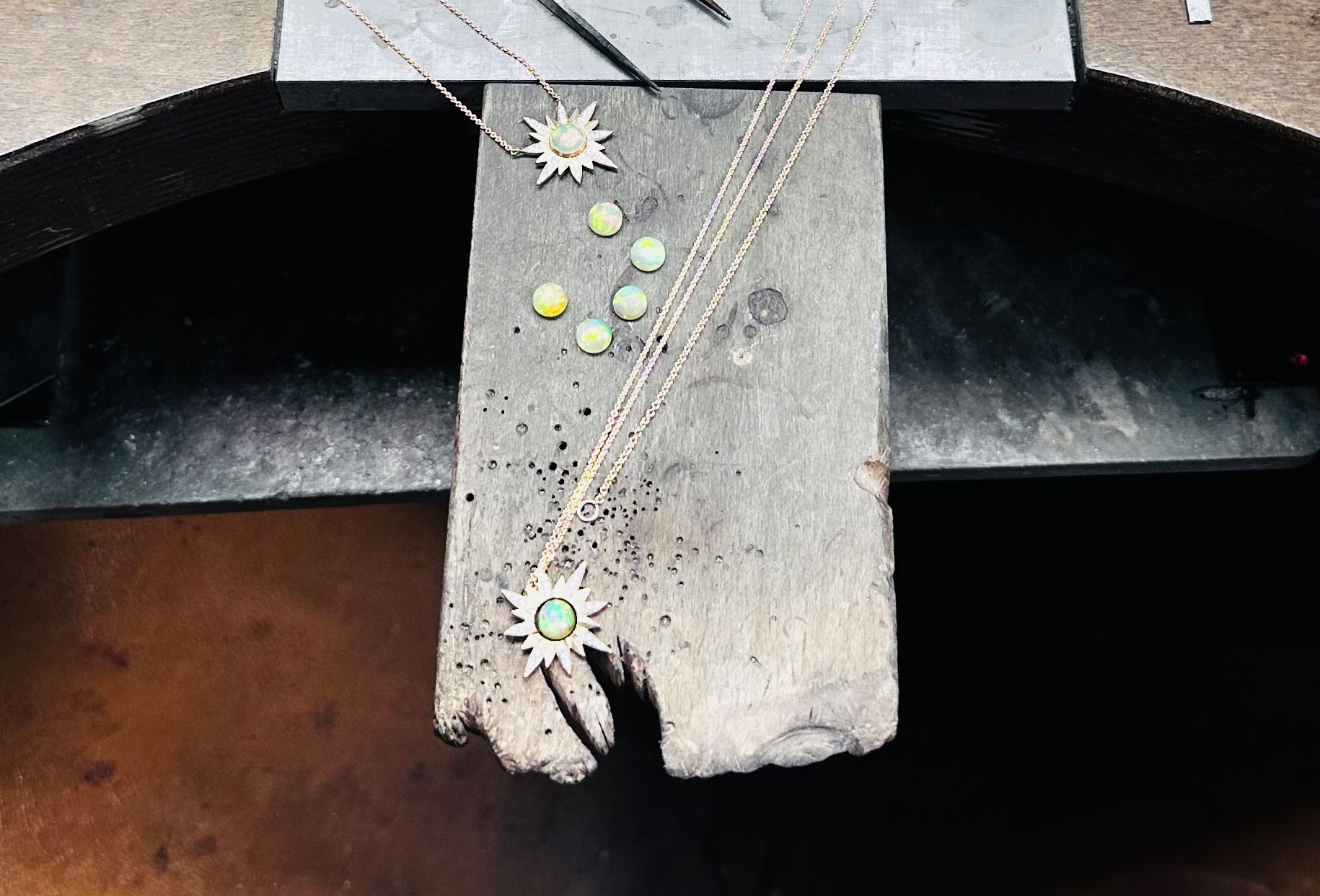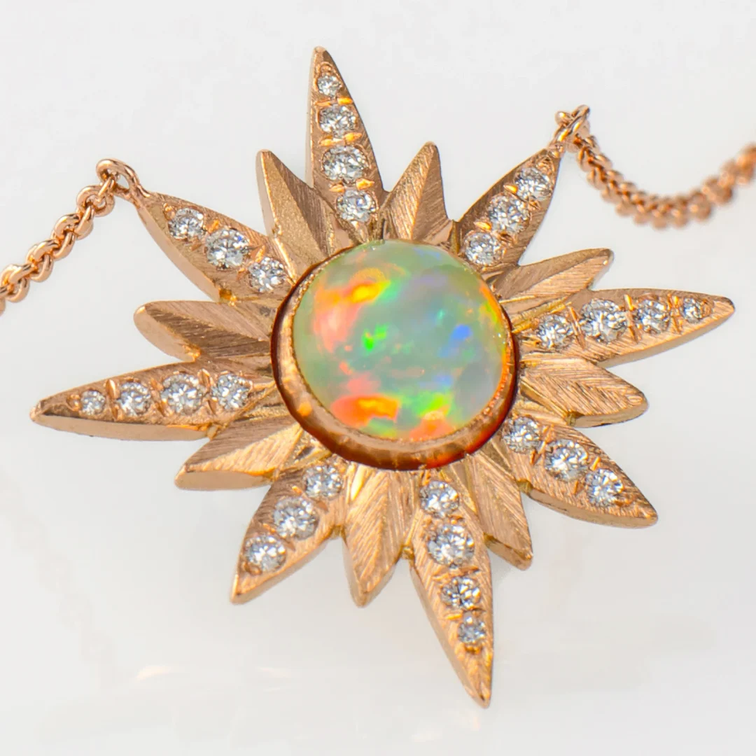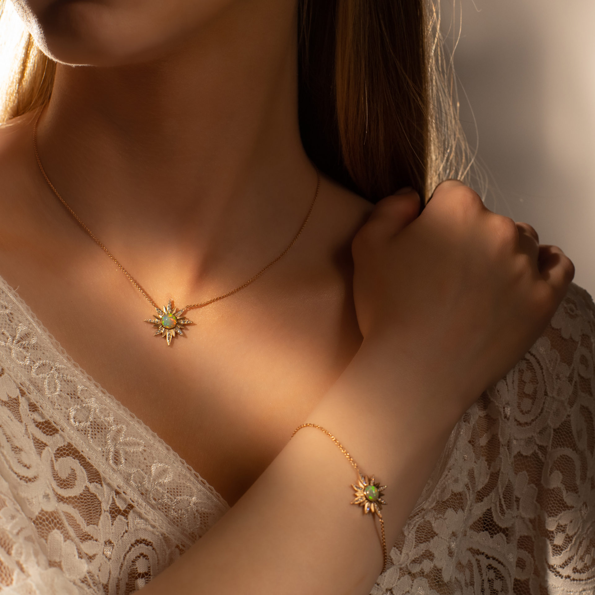 Îlios’ necklace, the Sun of Cyprus: embodied by Yellow Gold, it shines with its rays of diamonds and its heart of opal of a thousand changing colours.