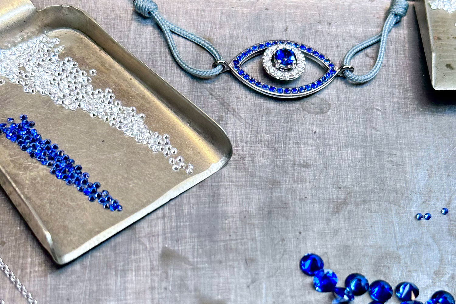 Mataki’ bracelet: a protective eye to ward off evil spirits, hypnotic diamond fire and fascinating sapphire-blue depth. Proportioned according to the Golden Mean, Mataki is a jewel and a talisman.