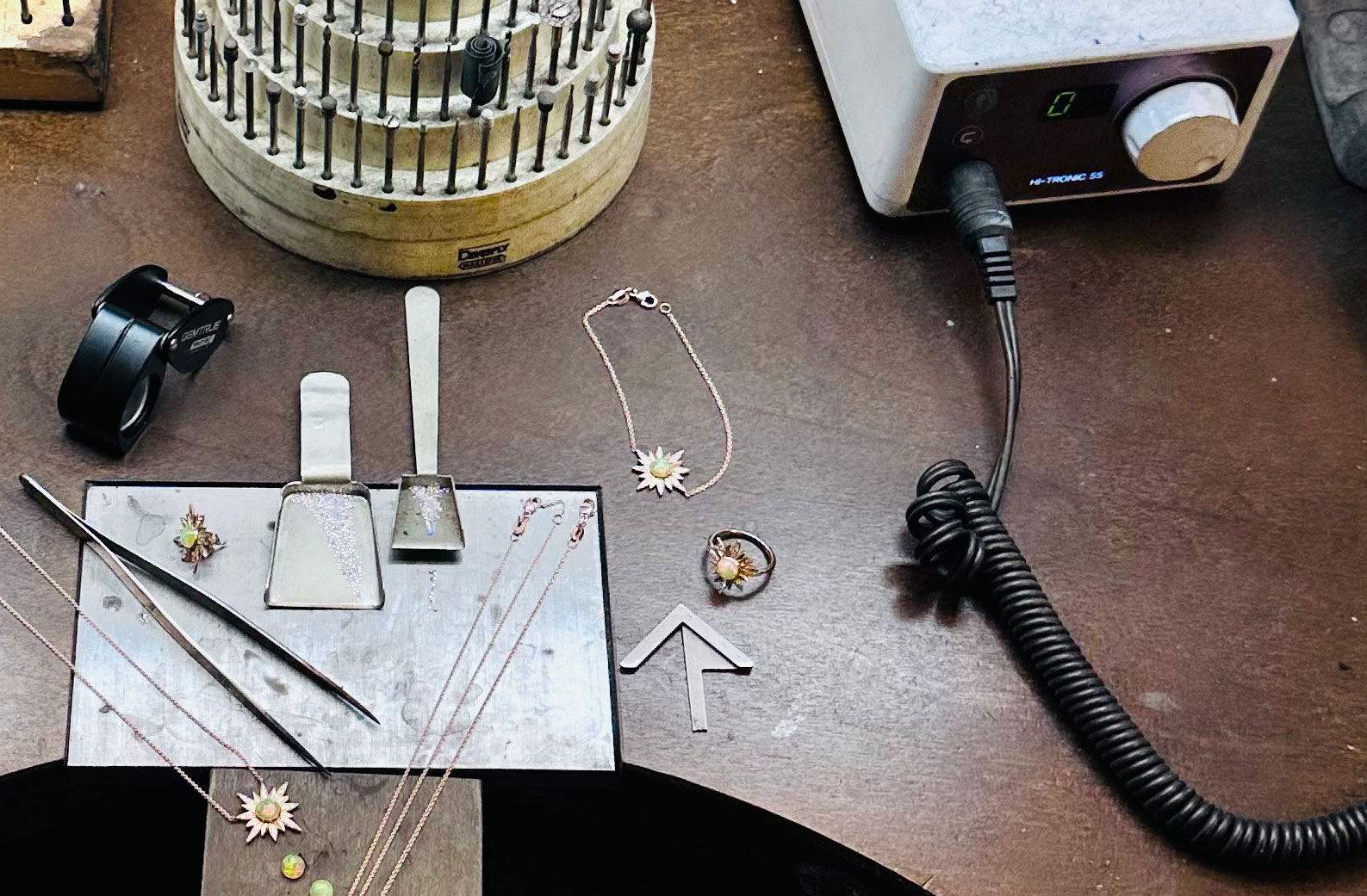 Fabriqué dans de l’Or 5N, un or plus cuivré que l’Or rose « classique », votre Îlios rougeoie comme un âtre. Soleil symbolique, ses rayons d’or sont façonnés avec des angles bruts et un polissage léger qui fait rendre à la matière sa couleur chaude. Les diamants en sertissage horloger apportent l’éclat, le coeur d’opale émet des couleurs mouvantes comme des flammes. Le sertissage de l’opale, un serti-clos à grains, est directement inspiré de la tradition joaillère chypriote.
