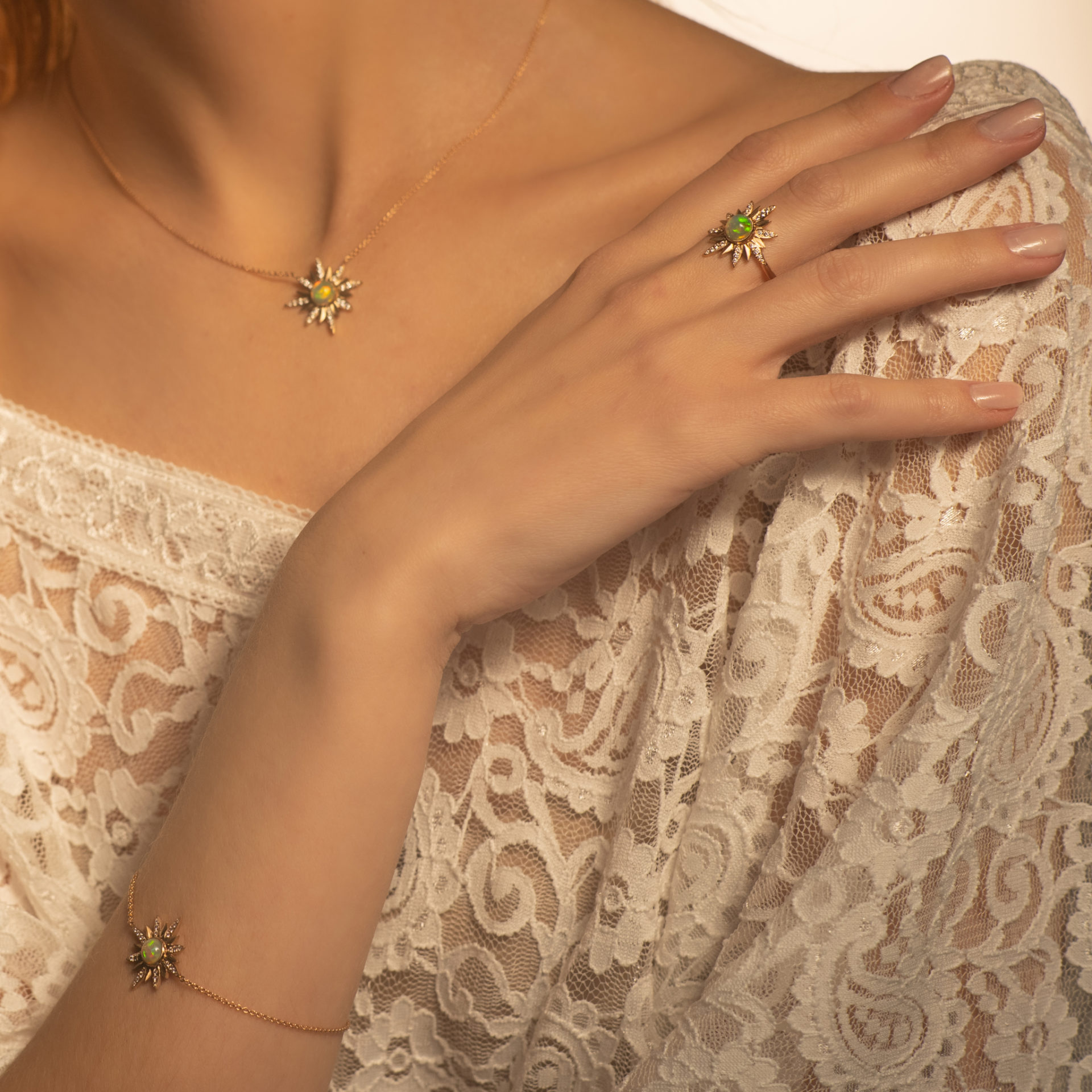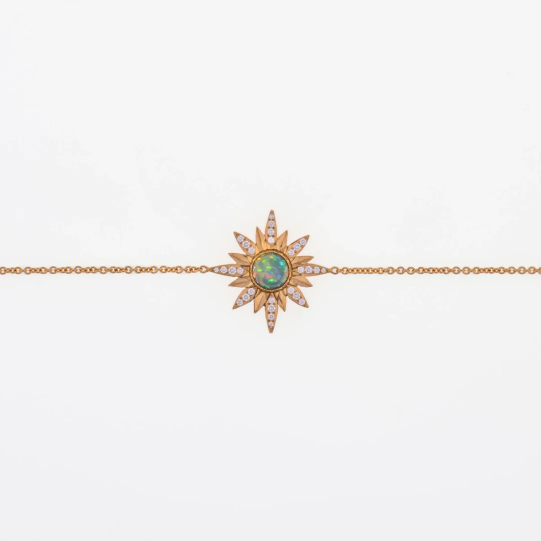 Bracelet « Îlios », le Soleil de Chypres: incarné par l’Or Jaune, il brille de ses rayons de diamants et son cœur d’opale aux mille couleurs changeantes.